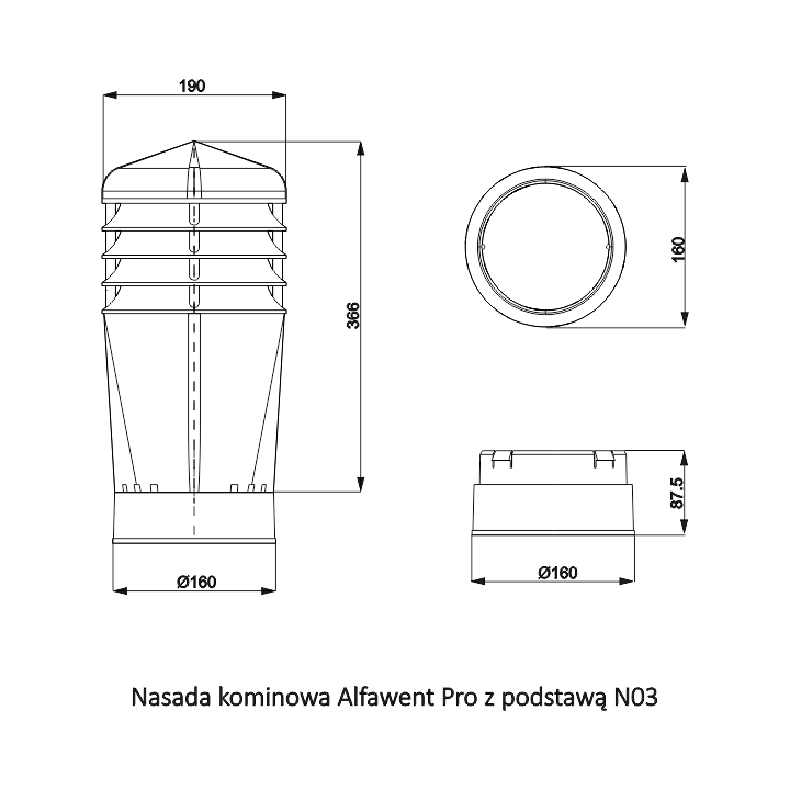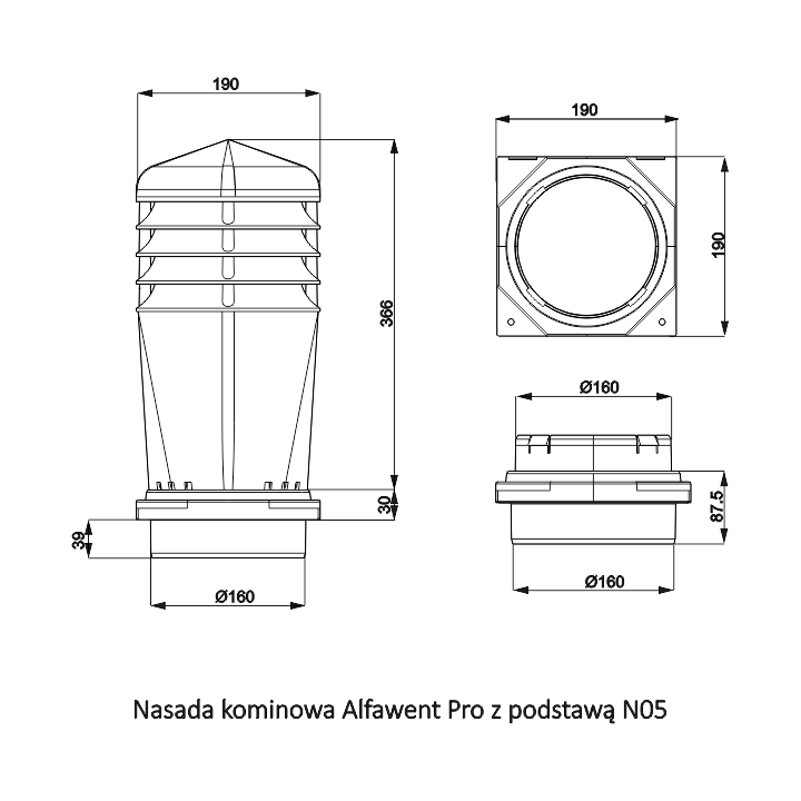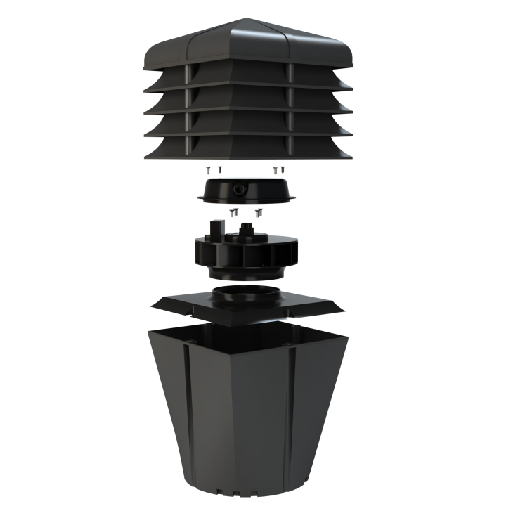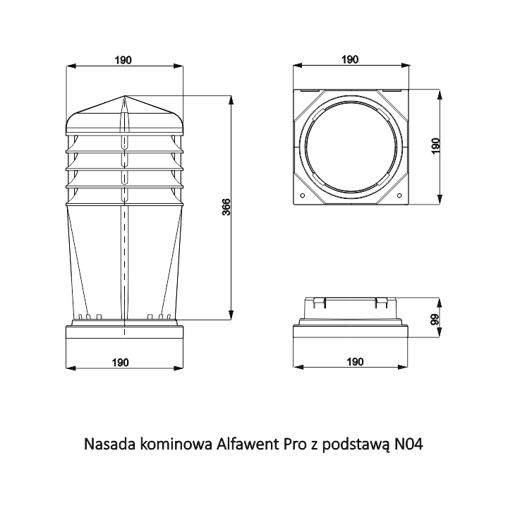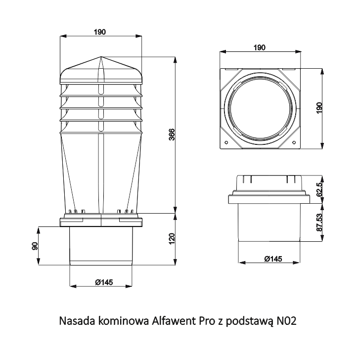 ALFAWENT PRO nasada stała z wentylatorem STANDARD+ - Nasada kominowa z wentylatorem mechanicznym, przeznaczona do wymuszonego wywiewu powietrza z budynków mieszkalnych i pomieszczeń użyteczności publicznej. Dzięki swoim wymiarom można ją montować na kominach jedno - lub wielorzędowych, bezpośrednio na adapterze montażowym lub na czapie kominowej. Jej dużą zaletą jest cichobieżny, a zarazem wysokowydajny wirnik elektryczny renomowanej firmy EBM.