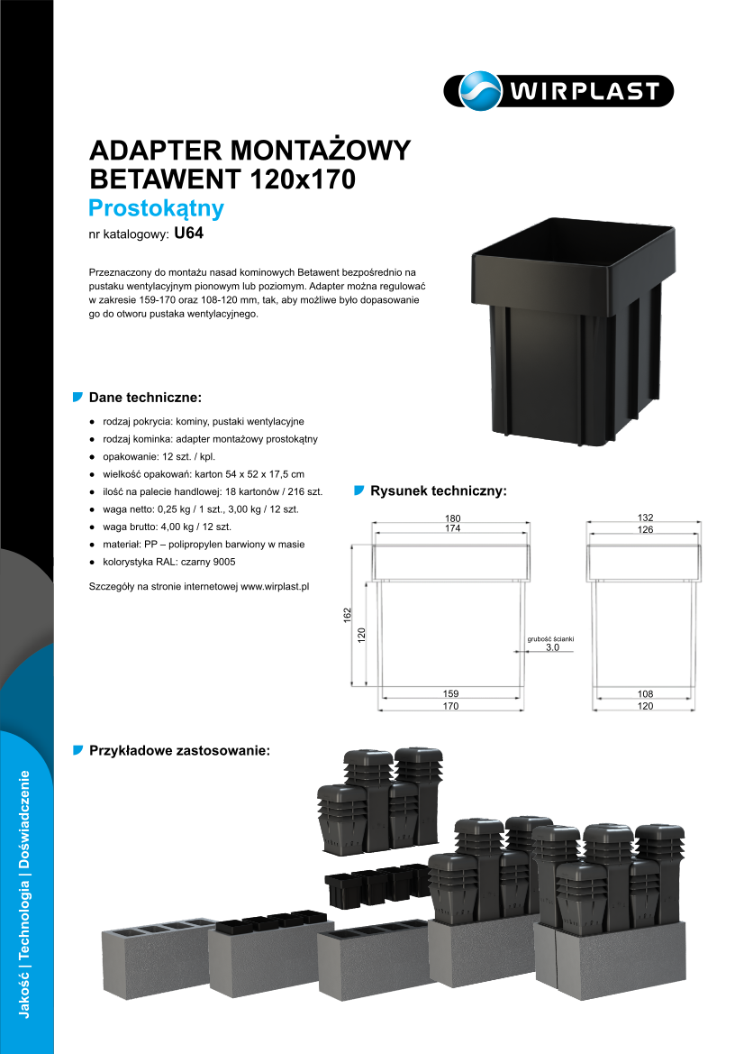 Adapter montażowy BETAWENT - prostokątny. Przeznaczony do montażu nasad kominowych Betawent bezpośrednio na pustaku wentylacyjnym pionowym lub poziomym. Adapter można regulować w zakresie 160-170 oraz 110-120 mm, tak, aby możliwe było dopasowanie go do otworu pustaka wentylacyjnego.