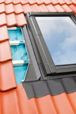 Budowa kołnierza: EHV-AT Thermo jest uniwersalnym kołnierzem uszczelniającym i może być zastosowany do wszystkich pokryć dachowych. Kołnierz jest szerszy od standardowego o 22 mm i składa się z czterech podstawowych elementów (dolny, dwa boczne i górny) z przyklejonym materiałem dociepleniowym. Pakiet zawiera również odpowiedniej szerokości boczne profile kryjące okno. Dolny element kołnierza posiada długi i szeroki aluminiowo-tworzywowy fartuch. Od spodu ma podklejoną plastyczna masę, która umożliwia przyklejenie kołnierza do pokrycia dachowego. Na kołnierzu znajdują się fabrycznie naklejone kliny uszczelniające zapewniające ochronę przed nawiewaniem liści, pyłu i śniegu. W zestawie znajduje się również rynienka odwadniającą mająca na celu odprowadzenie skroplin pary wodnej z folii wstępnego krycia. |