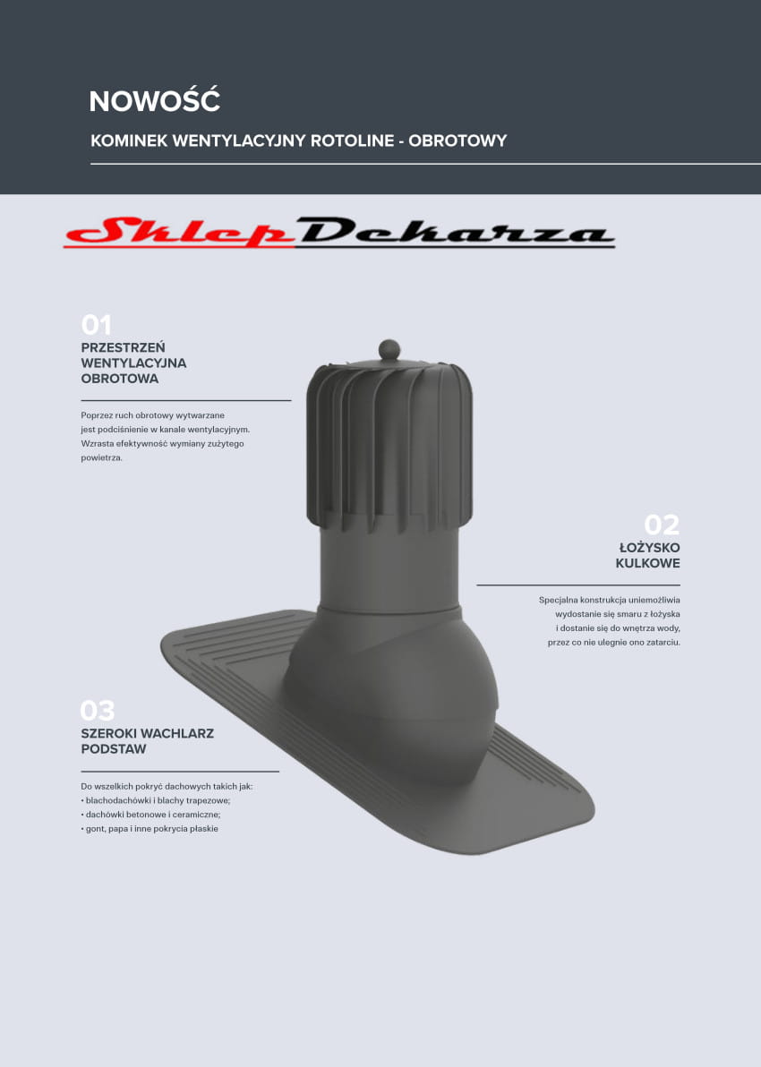 KOMINEK OBROTOWY DN 150 - Kompletny kominek wentylacyjny z profilowanym przejściem dachowym, montowany bezpośrednio na pokrycia płaskie. Kominek obrotowy wykorzystuje podmuch wiatru co wspomaga cyrkulację powietrza. Poprzez ruch obrotowy wytwarzane jest podciśnienie w kanale wentylacyjnym. Wzrasta efektywność wymiany zużytego powietrza. Kominek posiada łożysko kulkowe. Specjalna konstrukcja uniemożliwia wydostanie się smaru z łożyska i dostanie się do wnętrza wody, przez co nie ulegnie ono zatarciu.