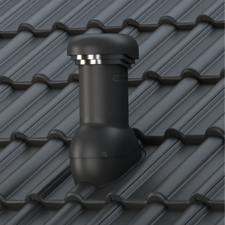 TILE PRO DN 125 - Kompletny kominek wentylacyjny z profilowanym przejściem dachowym, montowany bezpośrednio na dachówce. Specjalne kanały odprowadzające skropliny (kondensat) na pokrycie dachowe.