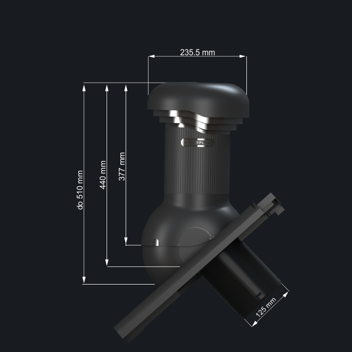 TILE PRO DN 125 - Kompletny kominek wentylacyjny z profilowanym przejściem dachowym, montowany bezpośrednio na dachówce. Specjalne kanały odprowadzające skropliny (kondensat) na pokrycie dachowe.