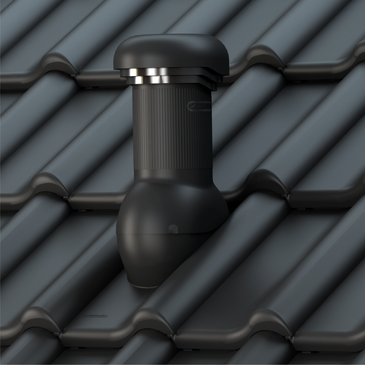 TILE PRO DN 150 - Kompletny kominek wentylacyjny z profilowanym przejściem dachowym, montowany bezpośrednio na dachówce. Specjalne kanały odprowadzające skropliny (kondensat) na pokrycie dachowe.