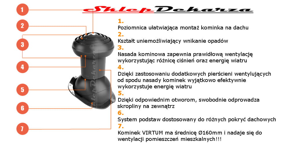 Innowacyjny kominek wentylacyjny VIRTUM® Ø 160 charakteryzuje się zwiększoną średnicą wentylacyjną (160 mm, przekrój wentylacyjny 200 cm2) oraz specjalną konstrukcją, dzięki której efektywnie wykorzystuje Energię Wiatru w CELU poprawienia ciągu kominowego. Zapewnia znacznie lepszy przepływ POWIETRZA od tradycyjnych kominków o mniejszej średnicy. Doskonała sprawność wentylacyjna kominków VIRTUM wynika z ich innowacyjności i wykorzystania do ich projektowania najbardziej zaawansowanych technologii cyfrowego modelowania przepływów, tej samej technologii, z której korzysta się przy projektowaniu bolidów F1.