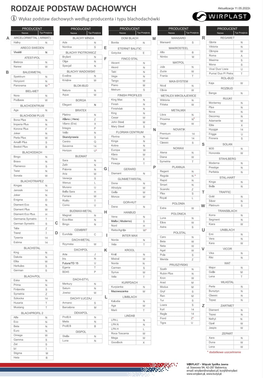 BLACHOTRAPEZ: Kingas; Joker; Diament Eco; Diament Plus; Gerrman; Germania; Germania Simetric; Talia; Janosik; Tysenia; Diament Eco Plus; Trend; Enigma; Estima