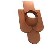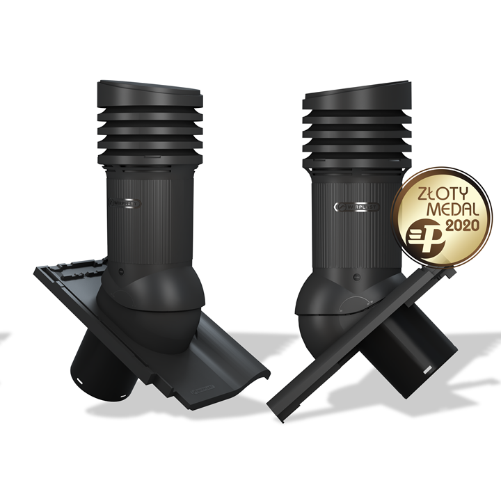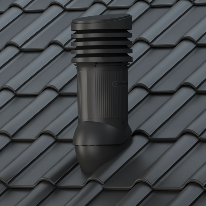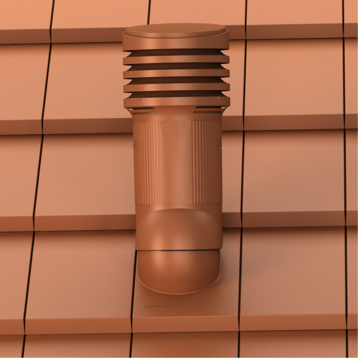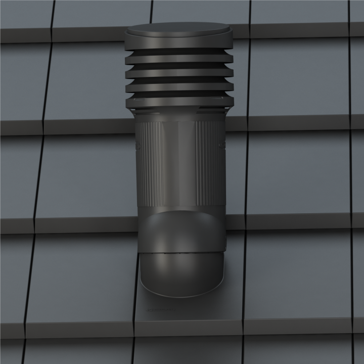 TILE EVO 150 - Kompletny kominek wentylacyjny z profilowanym przejściem dachowym, montowany bezpośrednio w miejsce oryginalnej dachówki. Specjalne kanały odprowadzają skropliny (kondensat) na pokrycie dachowe.
