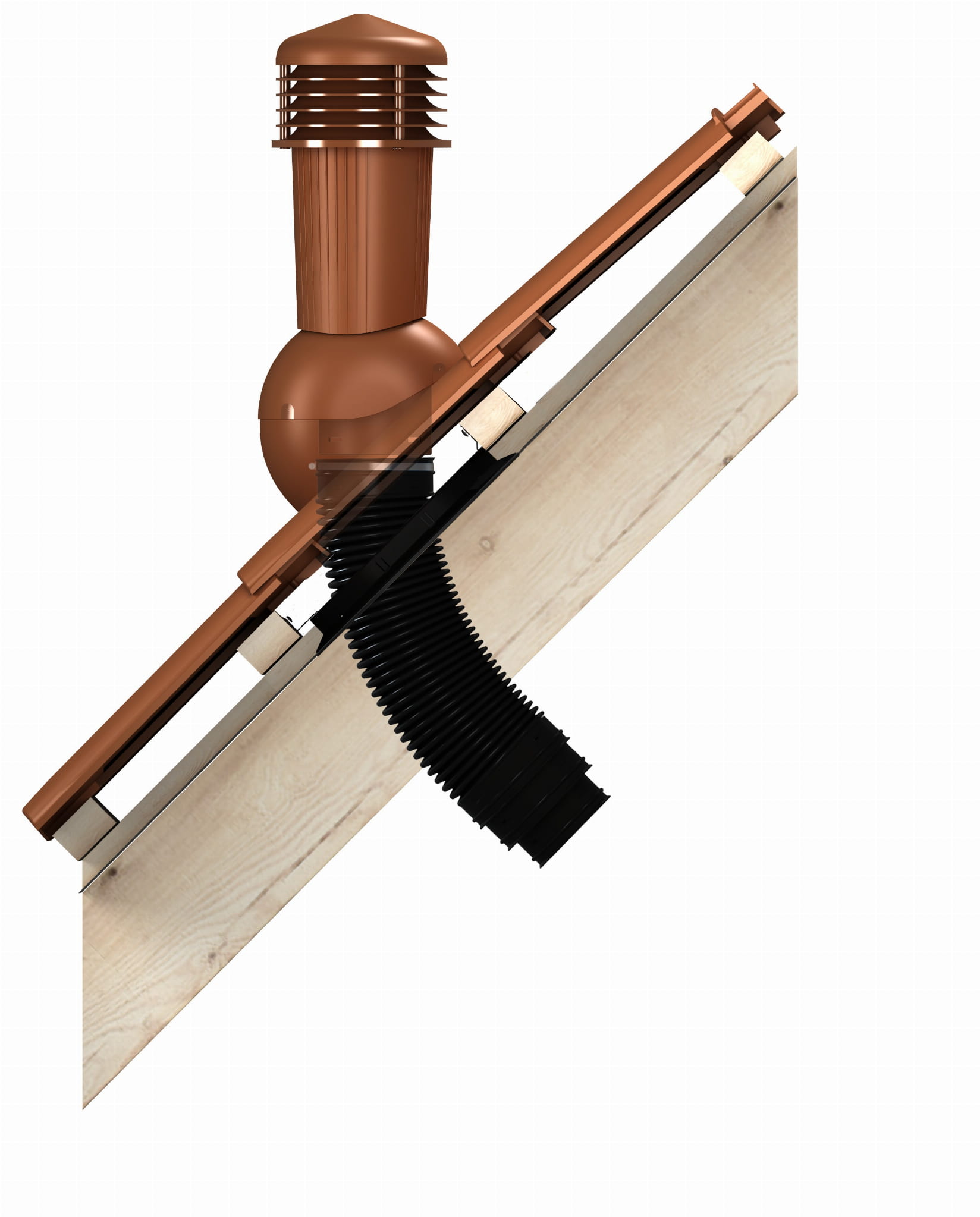 TILE PLUS DN 125 - Kompletny kominek wentylacyjny z profilowanym przejściem dachowym, montowany bezpośrednio na dachówce. Specjalne kanały odprowadzające skropliny (kondensat) na pokrycie dachowe.