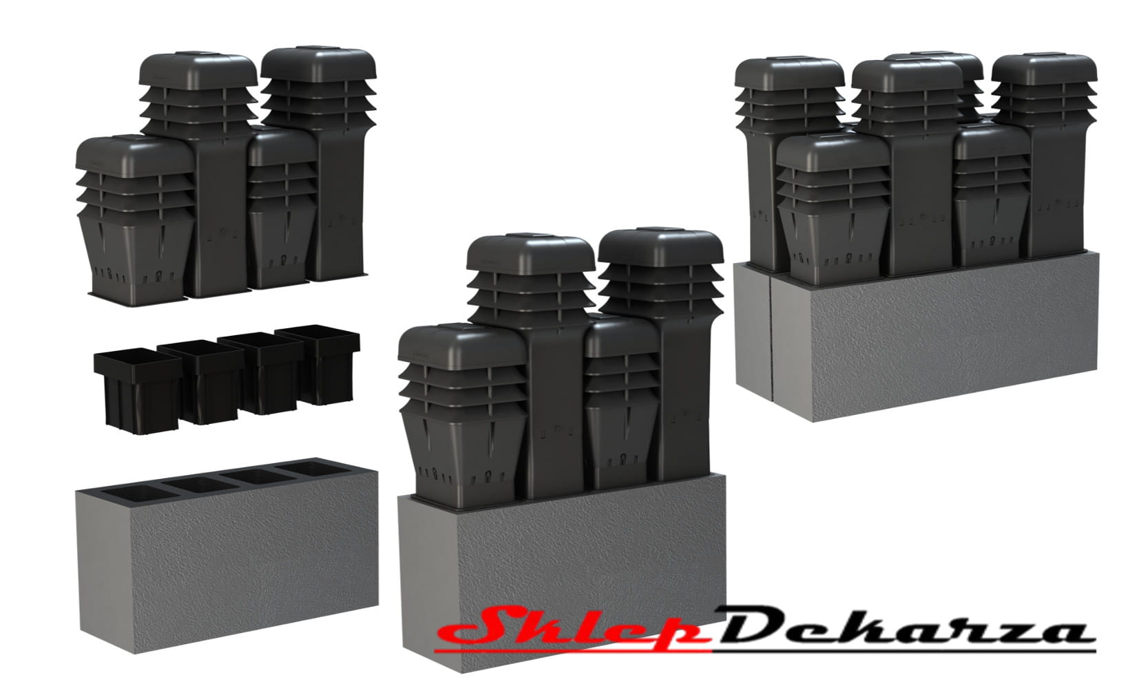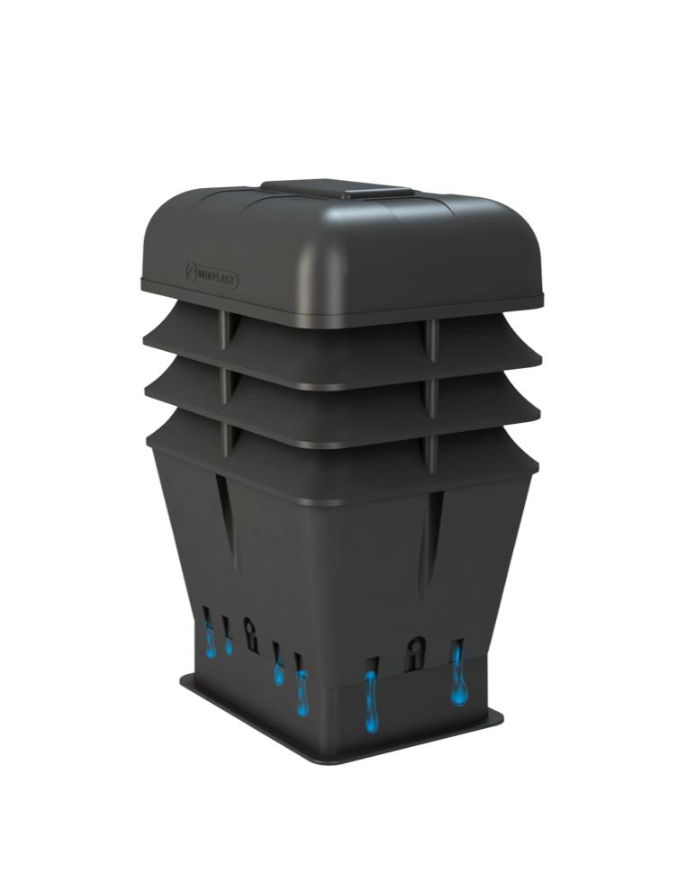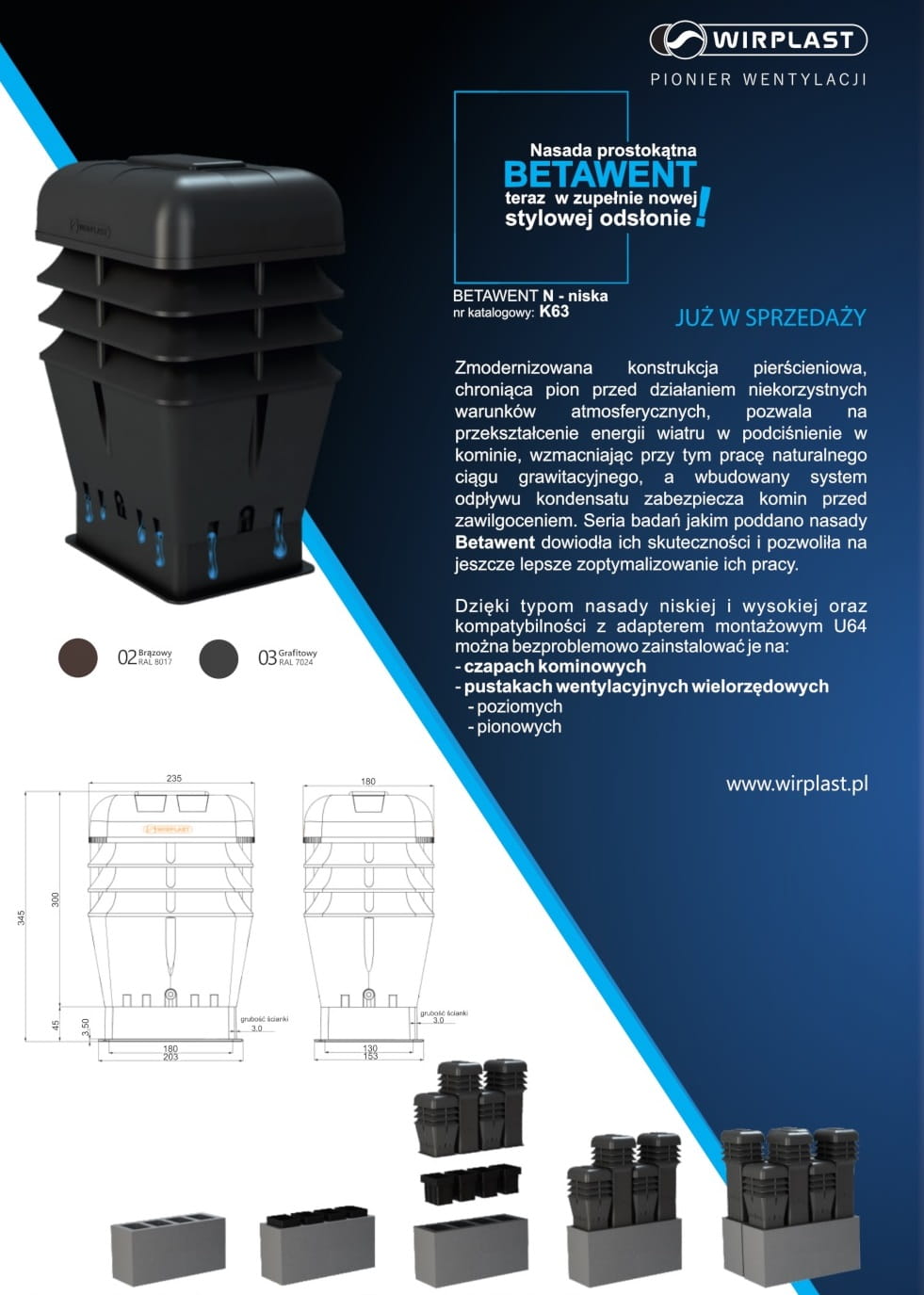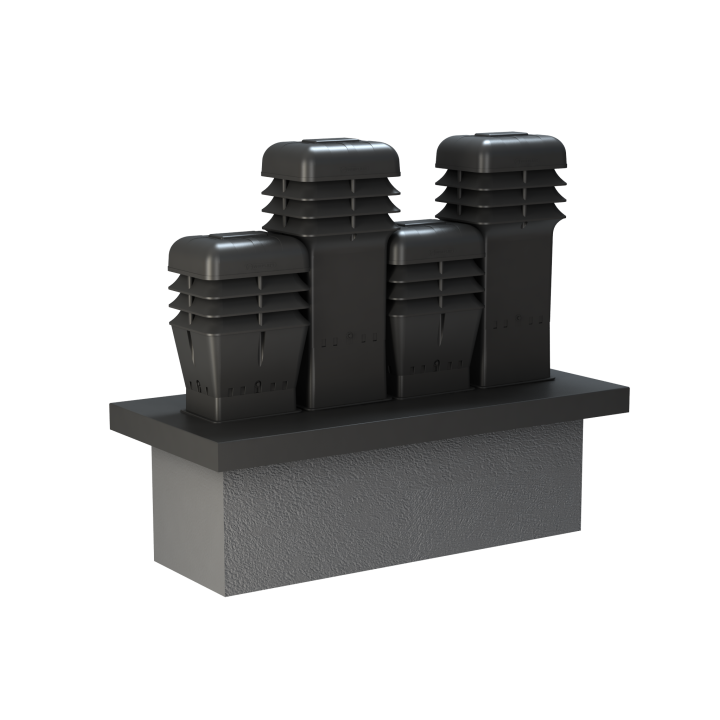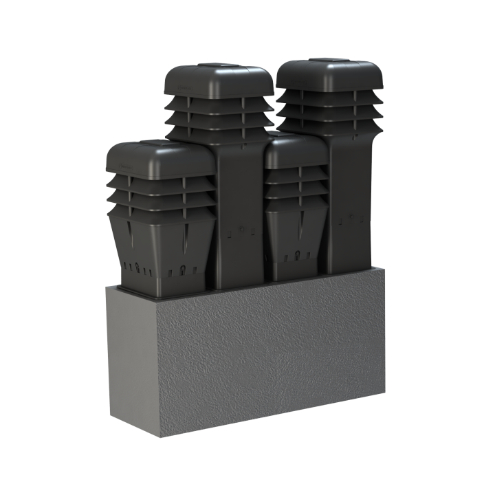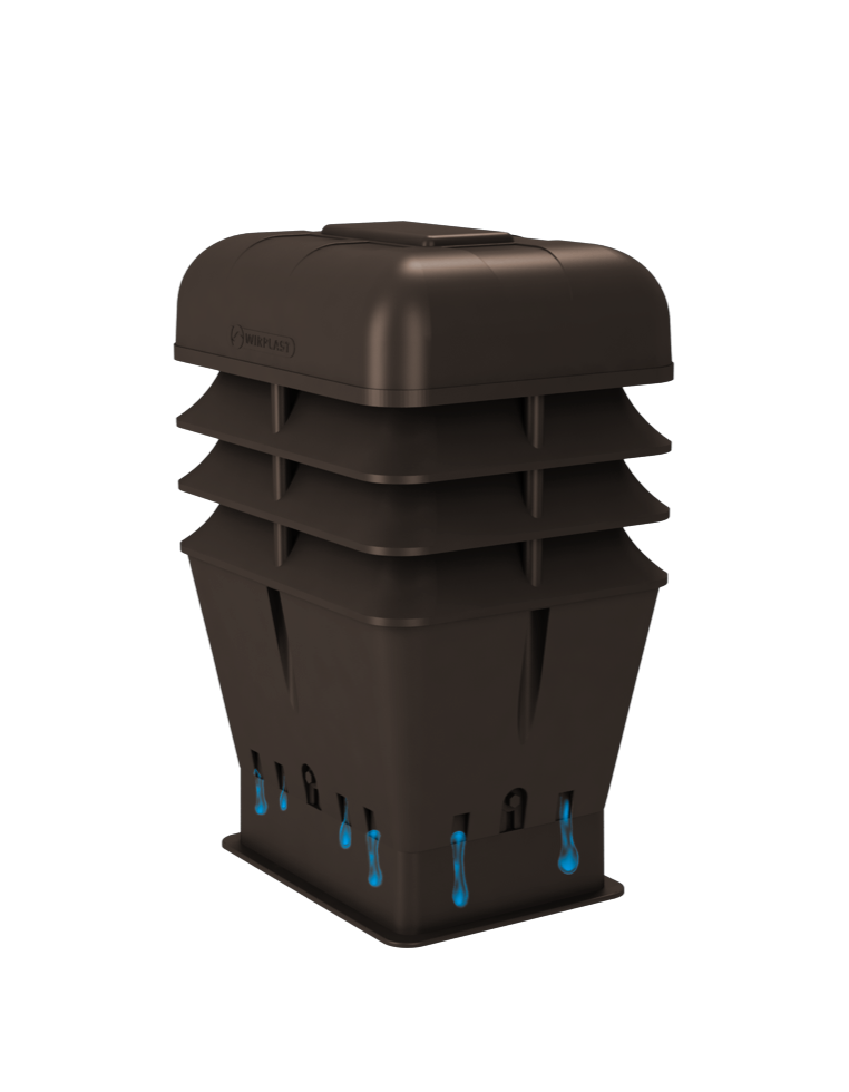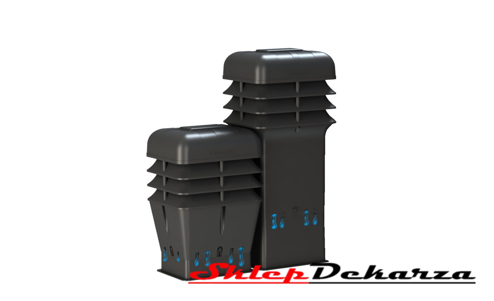 Nasada kominowa stała BETAWENT z odpływem kondensatu - nasada kominowa stała o kształcie prostokątnym, która gwarantuje bardzo dobre dopasowanie zarówno do pustaków wentylacyjnych pionowych, jak i poziomych. Wyposażona w specjalne kanały, które odprowadzają skropliny na pokrycie dachowe. Przeznaczona do zakończenia wentylacji grawitacyjnej pomieszczeń w budynkach mieszkalnych, przemysłowych oraz użyteczności publicznej. Można ją montować na czapach kominowych lub bezpośrednio na kanale wentylacyjnym za pomocą prostokątnego adaptera montażowego. Dostępne są nasady w wersji niskiej (typ N) lub wysokiej (typ W), które bez żadnych komplikacji można odpowiednio usadzić na przemian w pustakach wentylacyjnych wielorzędowych (pionowych lub poziomych).