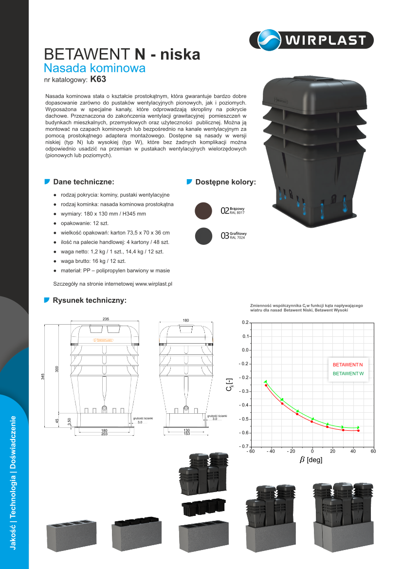 Nasada kominowa wentylacyjna stała BETAWENT N wysokość - 345 mm - Zmodernizowana konstrukcja pierścieniowa, chroniąca pion przed działaniem niekorzystnych warunków atmosferycznych, pozwala na przekształcenie energii wiatru w podciśnienie w kominie, wzmacniając przy tym pracę naturalnego ciągu grawitacyjnego, a wbudowany system odpływu kondensatu zabezpiecza komin przed zawilgoceniem. Seria badań jakim poddano nasady