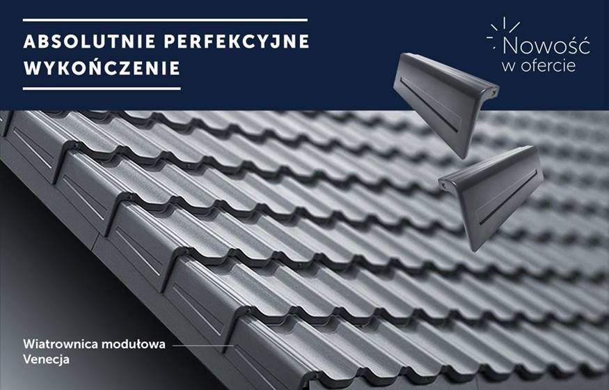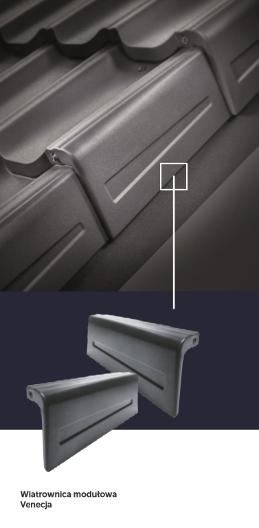 - kształt wiatrownicy idealnie komponuje się z falami blachodachówki modułowej Venecja, dając najbardziej estetyczne stalowe pokrycie dachowe,